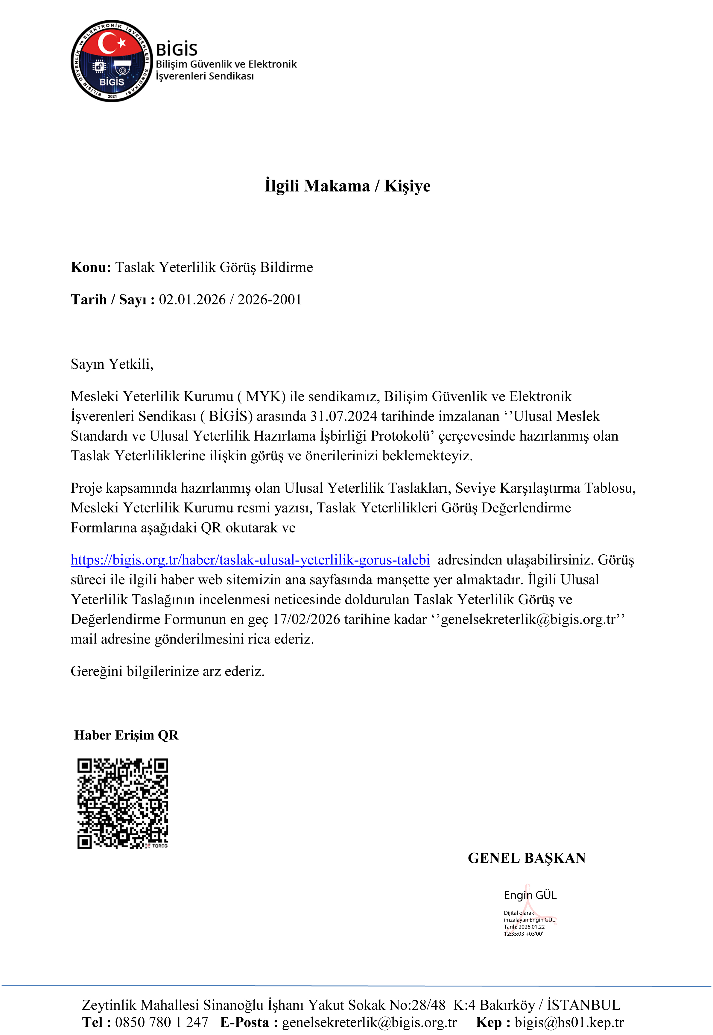 Değerli Sektör Paydaşlarımız, Mesleki Yeterlilik Kurumu (MYK) ile sendikamız Bilişim Güvenlik ve Elektronik İşverenleri Sendikası (BİGİS) arasında 31.07.2024 tarihinde imzalanan ‘’Ulusal Meslek Standardı ve Ulusal Yeterlilik Hazırlama İş birliği Protokolü’’ çerçevesinde hazırlanmış olan Taslak Ulusal Yeterliliklere ilişkin görüş ve önerilerinizi beklemekteyiz. Proje kapsamında hazırlanmış olan Ulusal Yeterlilik Taslakları, Seviye Karşılaştırma Tablosu, Mesleki Yeterlilik Kurumu imzalı resmi yazısı ve Taslak Ulusal Yeterlilik Görüş ve Değerlendirme Formlarına Aşağıda ki QR Okutarak ve https://bigis.org.tr/haber/taslak-ulusal-yeterlilik-gorus-talebi Adresinden ulaşabilirsiniz. Görüş süreci ile ilgili haber web sitemizin ana sayfasında manşette yer almaktadır. İlgili Ulusal Yeterlilik Taslağının incelenmesi neticesinde doldurulan Taslak Ulusal Yeterlilik Görüş ve Değerlendirme Formunun en geç 17.02.2026 tarihine kadar ‘’genelsekreterlik@bigis.org.tr’’ mail adresine gönderilmesini rica ederiz. Gereğini bilgilerinize arz ederiz.